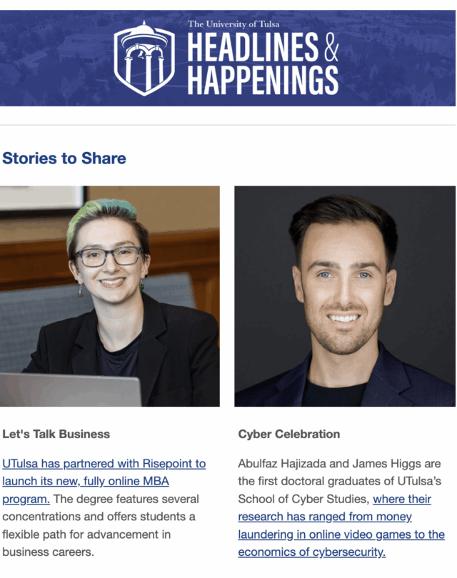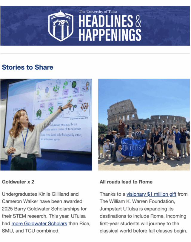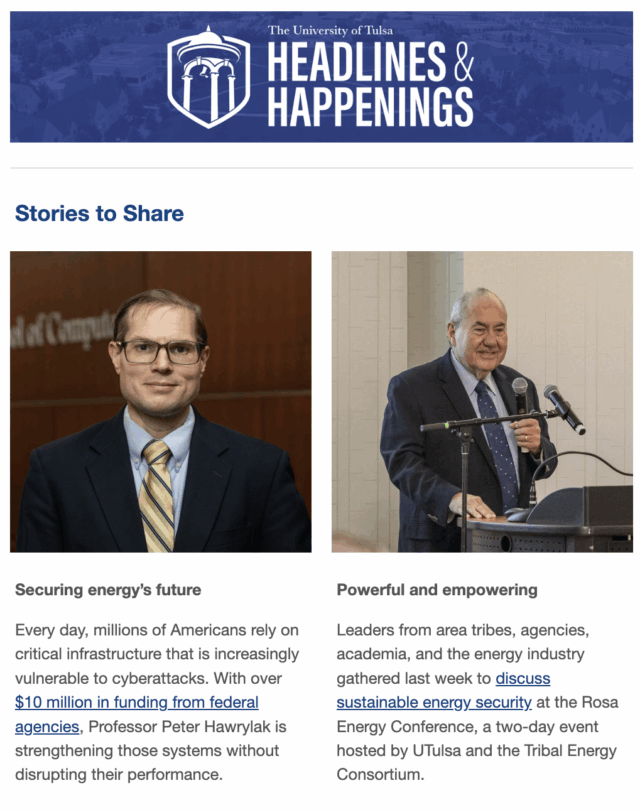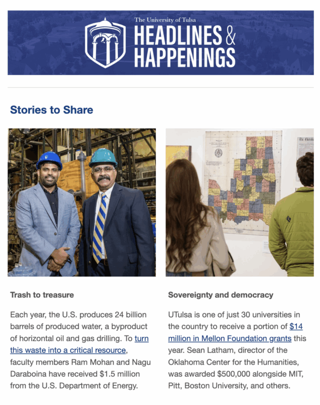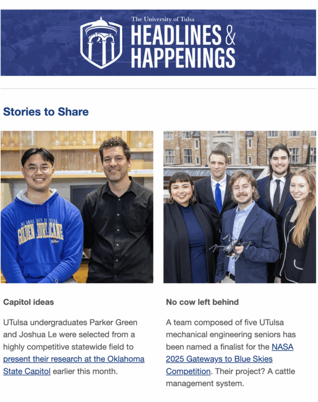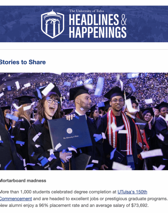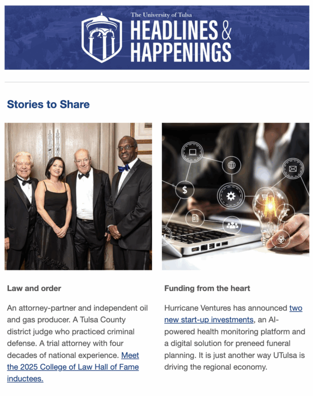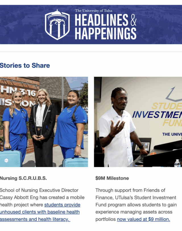 Have you heard? Each issue features news, events and articles about the great things happening at UTulsa. Subscribe to receive Headlines & Happenings emails in your mailbox and stay up-to-date!