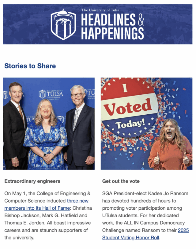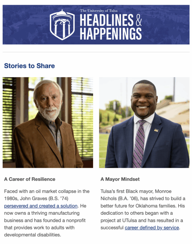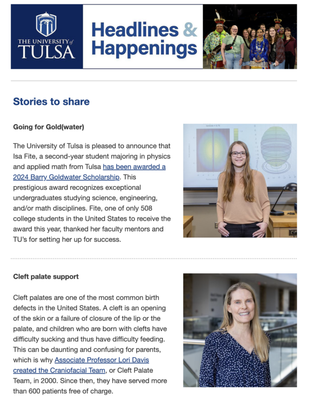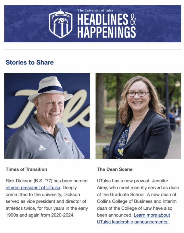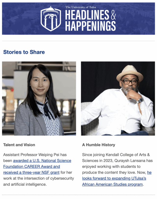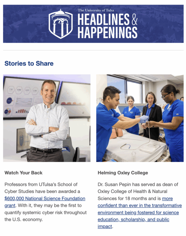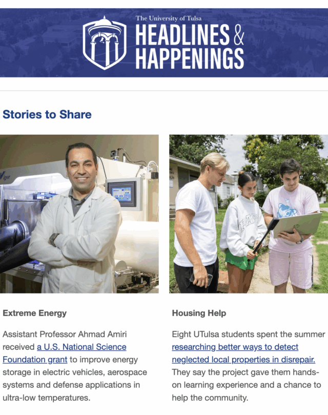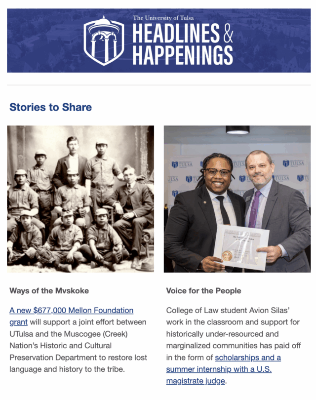 Have you heard? Each issue features news, events and articles about the great things happening at UTulsa. Subscribe to receive Headlines & Happenings emails in your mailbox and stay up-to-date!